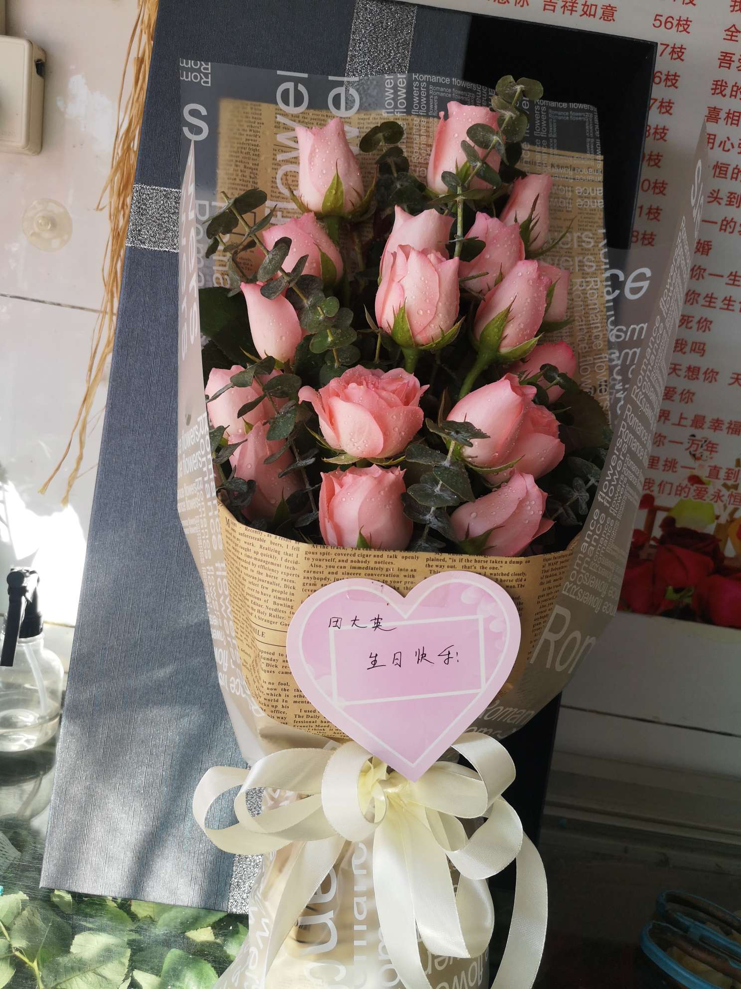 19枝精品粉玫瑰,搭配适量尤加利