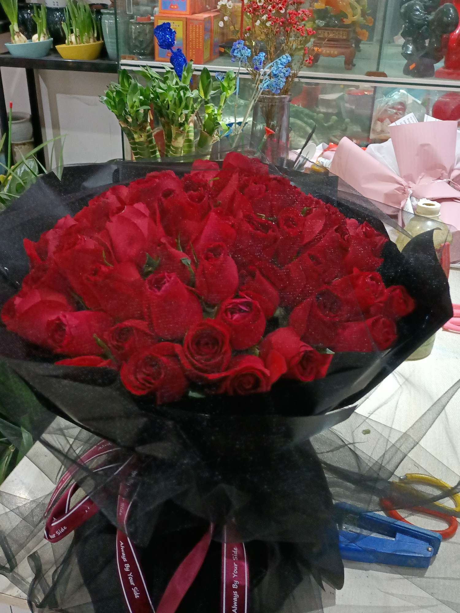 黑色雾面纸+黑色网纱包装,红色缎带束扎