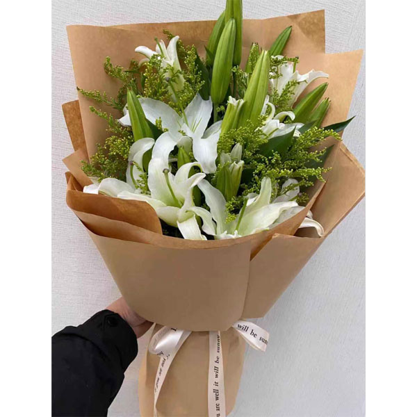 5枝多头白百合,搭配适量黄莺