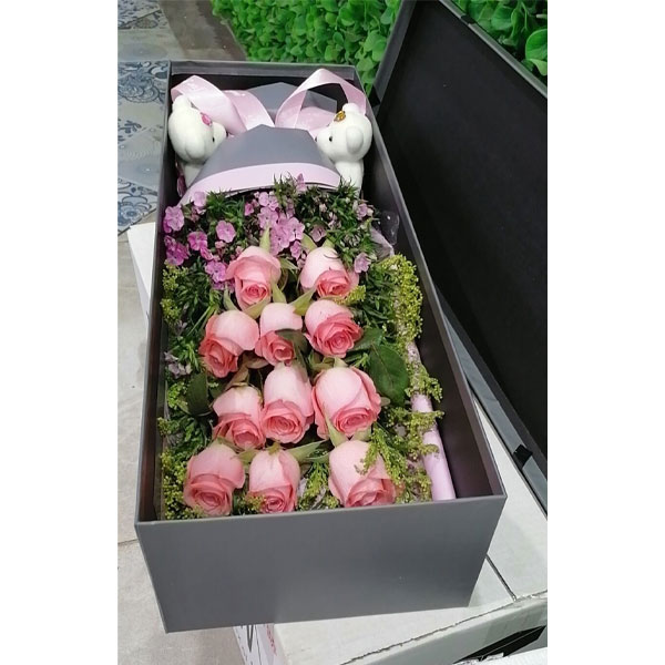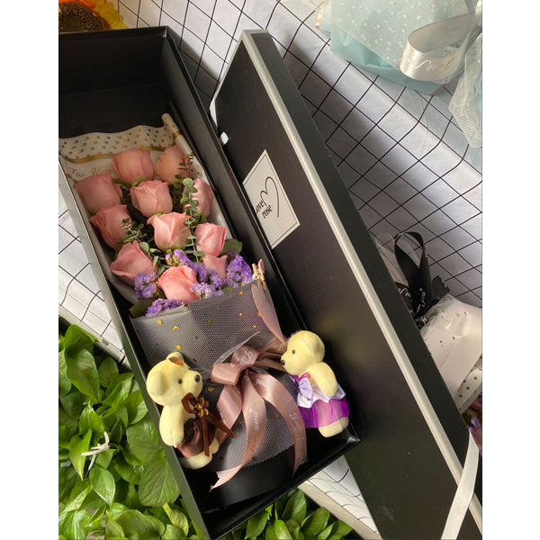 11枝戴安娜粉玫瑰,相思梅搭配,一对卡通小熊