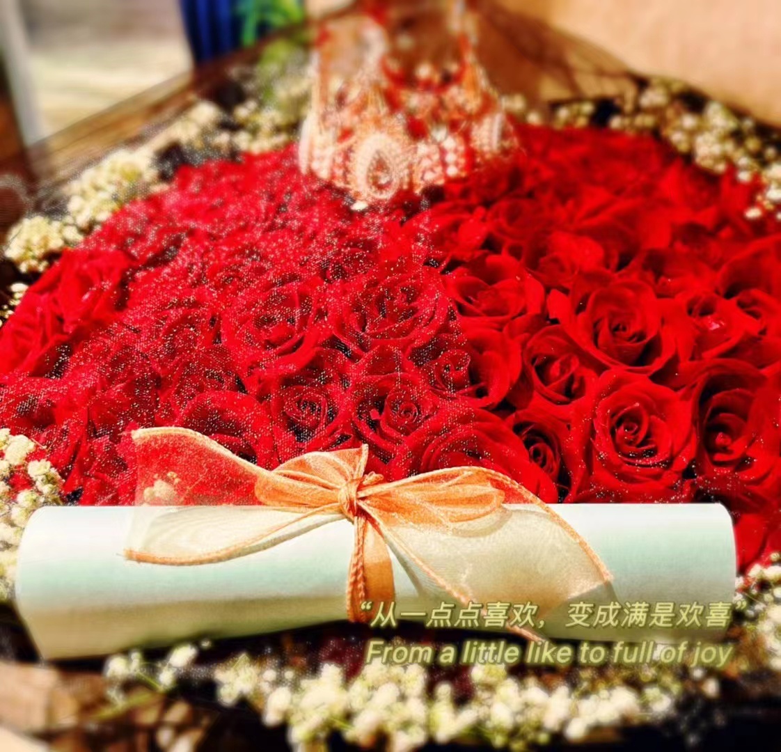 鲜花收到了。物流很快,当天就送到了。鲜花太漂亮了,颜色正,包装精美,闺蜜过生日。送给她很喜欢,物美价廉很满意的一次购物。
